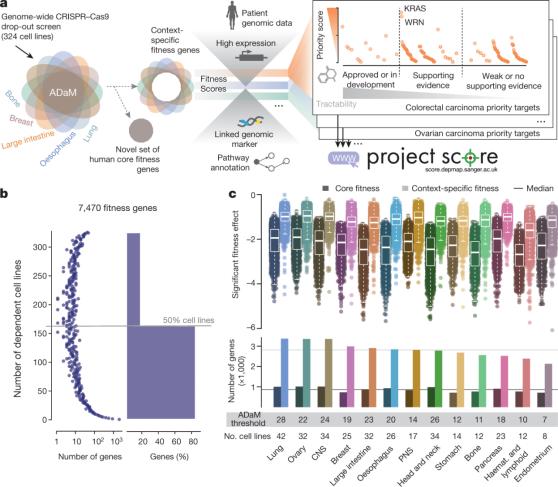 研究者们选择了来自30种不同的癌症、19种不同的组织的324种人类癌细胞系,并使用Illumina HiSeqTM 2000平台(仅供研究使用,不得用于诊断)对这些癌细胞进行高通量测序,然后对测序得到的18009个基因进行了共计941次的CRISPR–Cas9基因筛选,在数据分析中使用了Adaptive Daisy Model (ADaM) R包来区分环境特异性与核心适应性基因。通过计算每个基因的目标优先级分数,整合了多条证据线索,包括基因适应性效应、基因变异状态和临床突变频率等。筛选后的基因根据开发小分子和抗体的适用性进行了分类,并对优先靶标进行了追踪验证。