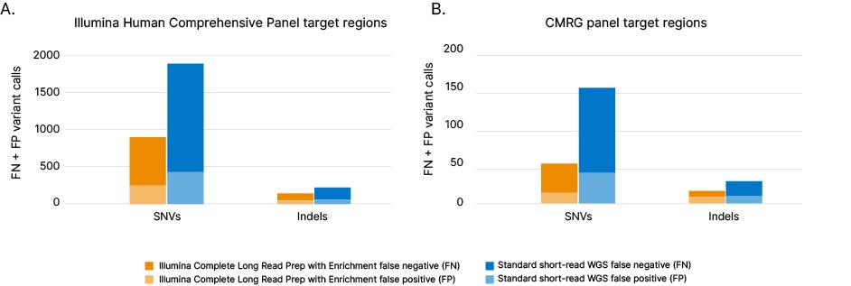 与标准短读长WGS(蓝色)相比,使用Illumina Complete Long Read Prep with Enrichment(橙色)在(A)Illumina Human Comprehensive Panel或(B)CMRG Panel靶向的HG002基因区域的SNP和插入缺失的假阴性(FN)和假阳性(FP)变异检出情况。
